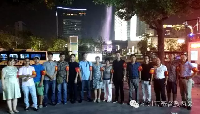 图:杭州市基督教两会微信7月30日晚,为了迎接G20峰会的到来,杭州城区八所教堂的20名青年牧师、长老、义工组成志愿服务队,协助天水街道参与了武林广场的平安巡防工作。大家统一佩戴“平安巡防”红袖章,学习注意事项和应急处理方法,认真执勤,微笑服务,积极踊跃护航G20。