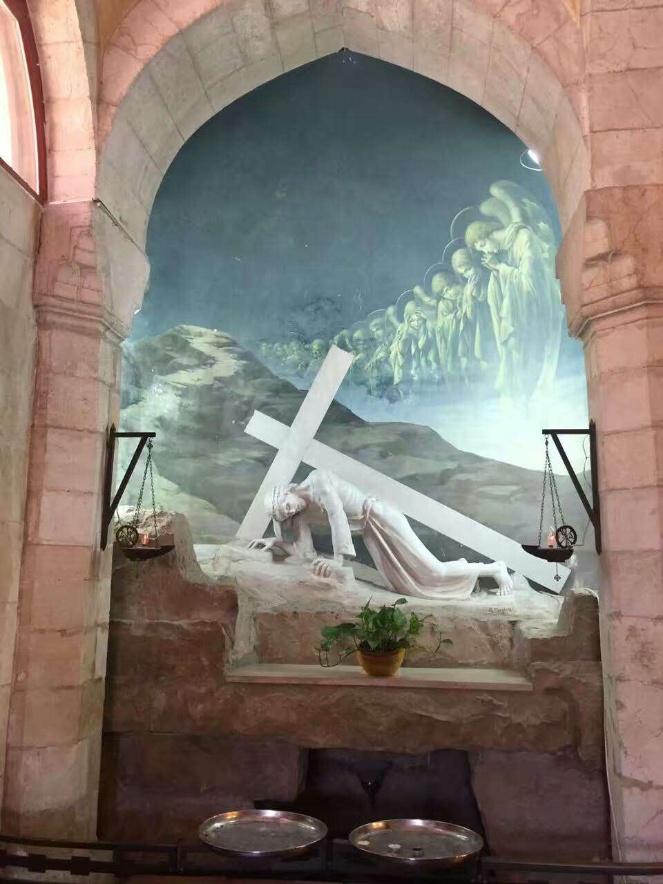 来过耶路撒冷的人,必不能错过苦路十四站,主耶稣当年就是扛着沉重的十架,走过这一条路的,一路上他停留了十四次,而苦路十四站也因此得名。我们按着每一个标识走过那一站站,也曾听说有信徒在走过这段路时因不堪身心的压力而痛哭甚至昏厥。是的,这一路真的很压抑,无罪的人却背着沉重的十架,在教堂边挂着有与当年相仿的十架,我试图抱起,但真的真的是太沉了。当这重压被亲身感受时,我觉得我真的承受不了。这一路也是苦闷的,每一站都是眼泪,每一站都充满着悲痛。直到主耶稣复活时,我们才看到了曙光,我们的心才得了安慰。