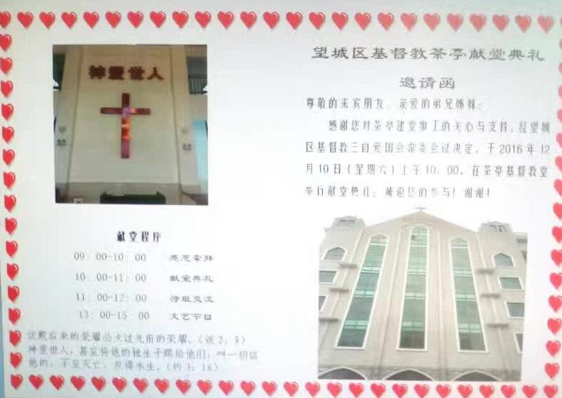 12月10日,湖南省长沙市望城区基督教茶亭感恩堂举办献堂庆典,庆典分为四个部分:感恩崇拜、献堂典礼、诗班交流、文艺节目。