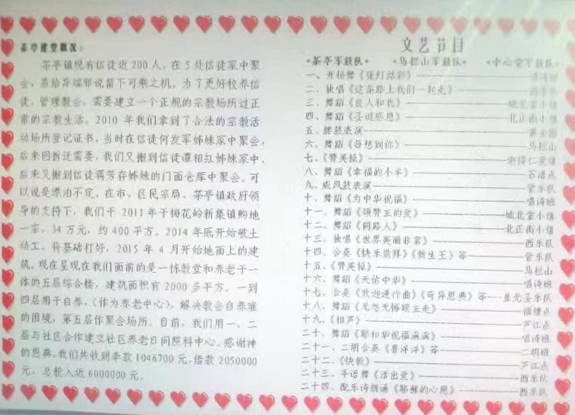 据茶亭感恩堂介绍,茶亭镇现有信徒近200人。感恩堂共有5层,1-4层将作为养老中心用于教会的自养,5楼作为聚会场所。感恩堂建筑面积为2000多平方米,总投入近600万元,其中有205万元的借款。
